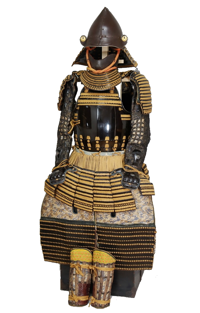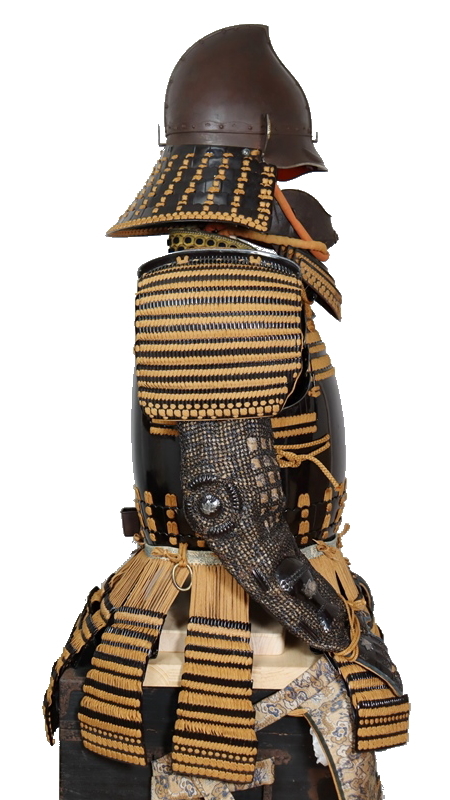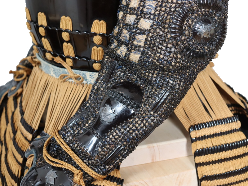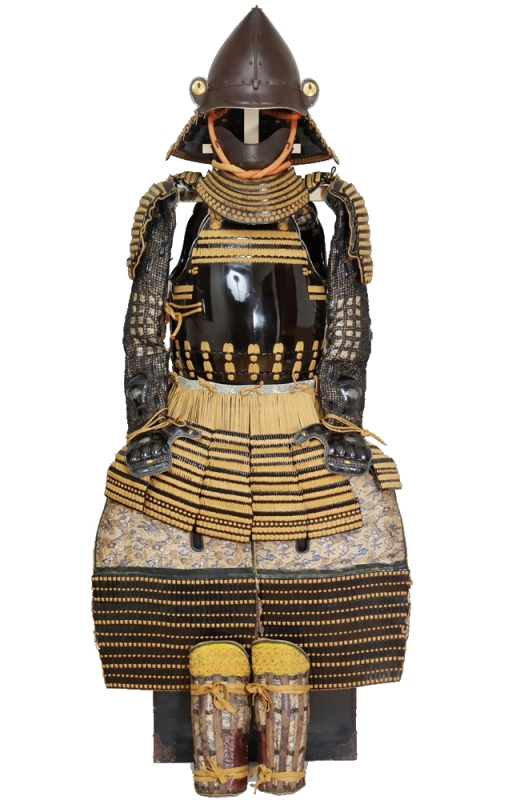 黒漆の艶が光る美しい具足。無紋の櫃付。