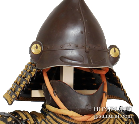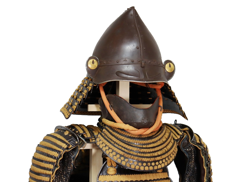 兜は鉄錆地桃形兜。鎬には共鉄の縄目覆輪、腰巻に共鉄桧垣を廻らし座星を打つ。鉄錆地の眉指に大きく眉を打ち出す。眉指に銀覆輪を廻らし、吹返しは眉指と同仕立で、金銅割杏葉菊据紋を打つ。鉄黒漆塗碁石頭五段日根野しころを朽葉糸素懸威朽葉糸一段菱綴とする。面具は鉄錆地燕頬。顎に梅型の切鉄と座鉄を打つ。垂れは鉄黒漆塗板物四段を朽葉糸毛引威朽葉糸一段菱綴とする。胴は前正中に鎬を立てた鉄黒漆塗胸取仏二枚胴。金具廻りに銀覆輪を廻らす。草摺は練革黒漆塗本小札十二間五段を朽葉糸毛引威朽葉糸二段菱綴とする。鉄黒漆塗切付小札七段当世袖を朽葉糸毛引威朽葉糸一段菱綴とする。揚羽蝶銀金具を手甲、瓢、肘鉄に打った鉄黒漆塗瓢籠手、練革黒漆塗伊予佩楯、鉄錆地篠脛当は緞子の家地一作。