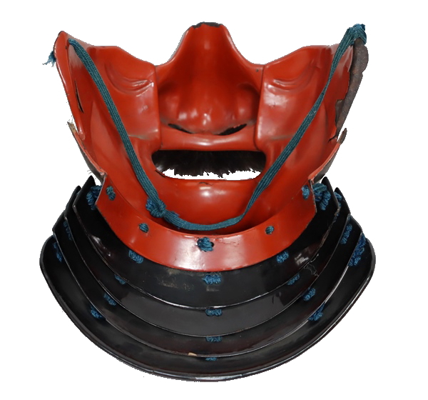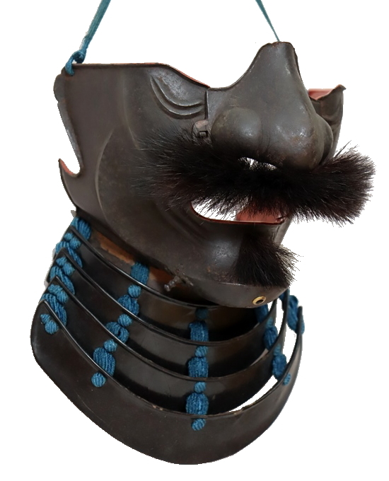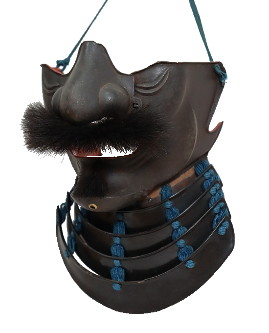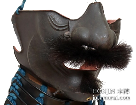 大きく突き出た鼻と豊かな黒熊毛の髭が特徴の鉄錆地烈勢面。鼻は掛け外し。起伏の激しい頬としゃくれた顎を打ち出す。面垂れは鉄黒漆塗板物四段を浅葱糸素懸威とする。面裏は朱漆塗。