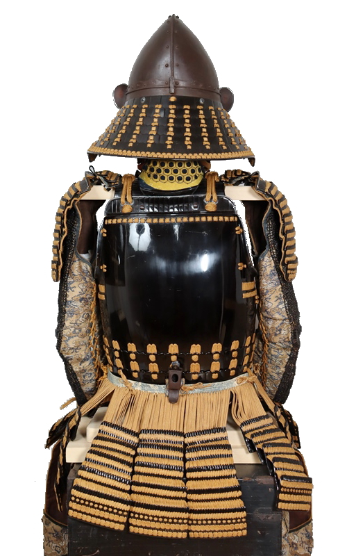 黒漆の艶が光る美しい具足。無紋の櫃付。