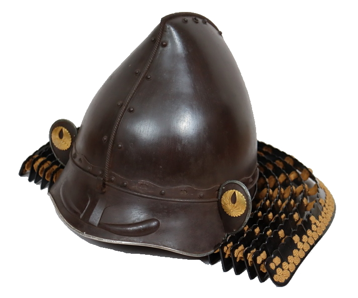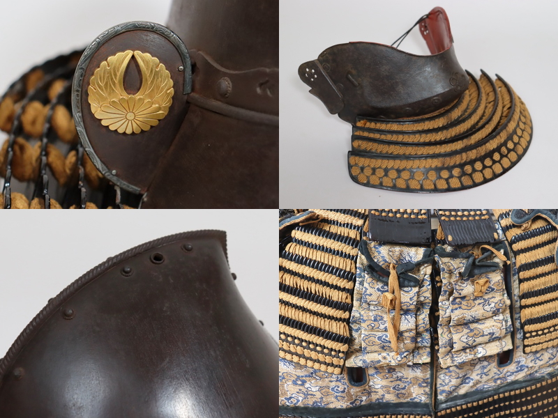 兜は鉄錆地桃形兜。鎬には共鉄の縄目覆輪、腰巻に共鉄桧垣を廻らし座星を打つ。鉄錆地の眉指に大きく眉を打ち出す。眉指に銀覆輪を廻らし、吹返しは眉指と同仕立で、金銅割杏葉菊据紋を打つ。鉄黒漆塗碁石頭五段日根野しころを朽葉糸素懸威朽葉糸一段菱綴とする。面具は鉄錆地燕頬。顎に梅型の切鉄と座鉄を打つ。垂れは鉄黒漆塗板物四段を朽葉糸毛引威朽葉糸一段菱綴とする。胴は前正中に鎬を立てた鉄黒漆塗胸取仏二枚胴。金具廻りに銀覆輪を廻らす。草摺は練革黒漆塗本小札十二間五段を朽葉糸毛引威朽葉糸二段菱綴とする。鉄黒漆塗切付小札七段当世袖を朽葉糸毛引威朽葉糸一段菱綴とする。揚羽蝶銀金具を手甲、瓢、肘鉄に打った鉄黒漆塗瓢籠手、練革黒漆塗伊予佩楯、鉄錆地篠脛当は緞子の家地一作。