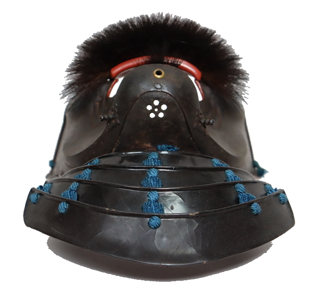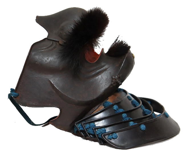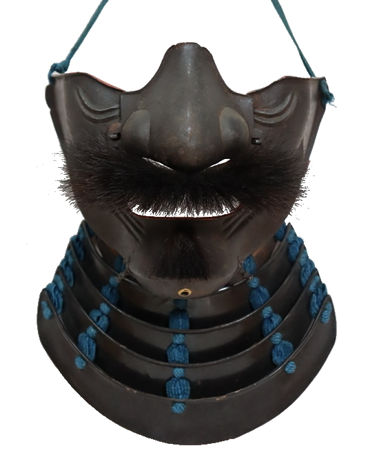 大きく突き出た鼻と豊かな黒熊毛の髭が特徴の鉄錆地烈勢面。鼻は掛け外し。起伏の激しい頬としゃくれた顎を打ち出す。面垂れは鉄黒漆塗板物四段を浅葱糸素懸威とする。面裏は朱漆塗。